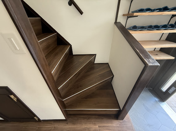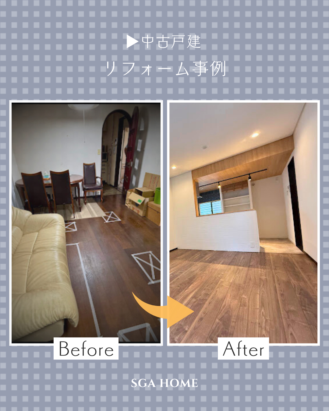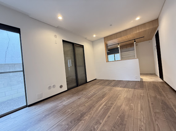 リビングは白壁+ダウンライトで光が均一に回っていて、リフォーム前より奥行きが感じられます。床の木目は少しグレージュ寄りで、落ち着いたナチュラル感を♪
