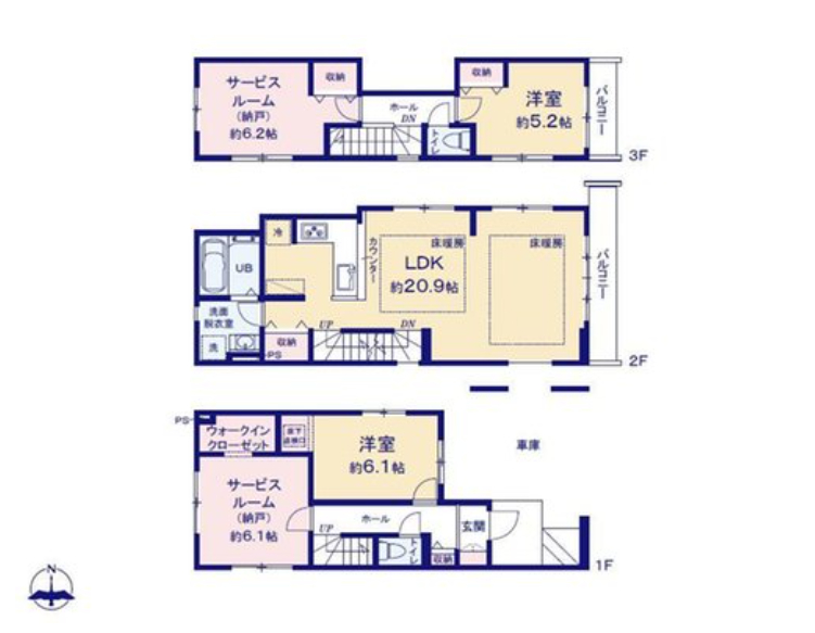 ビルトインガレージ付き、3面採光のLDKは明るく開放的な20帖超の3階建て
